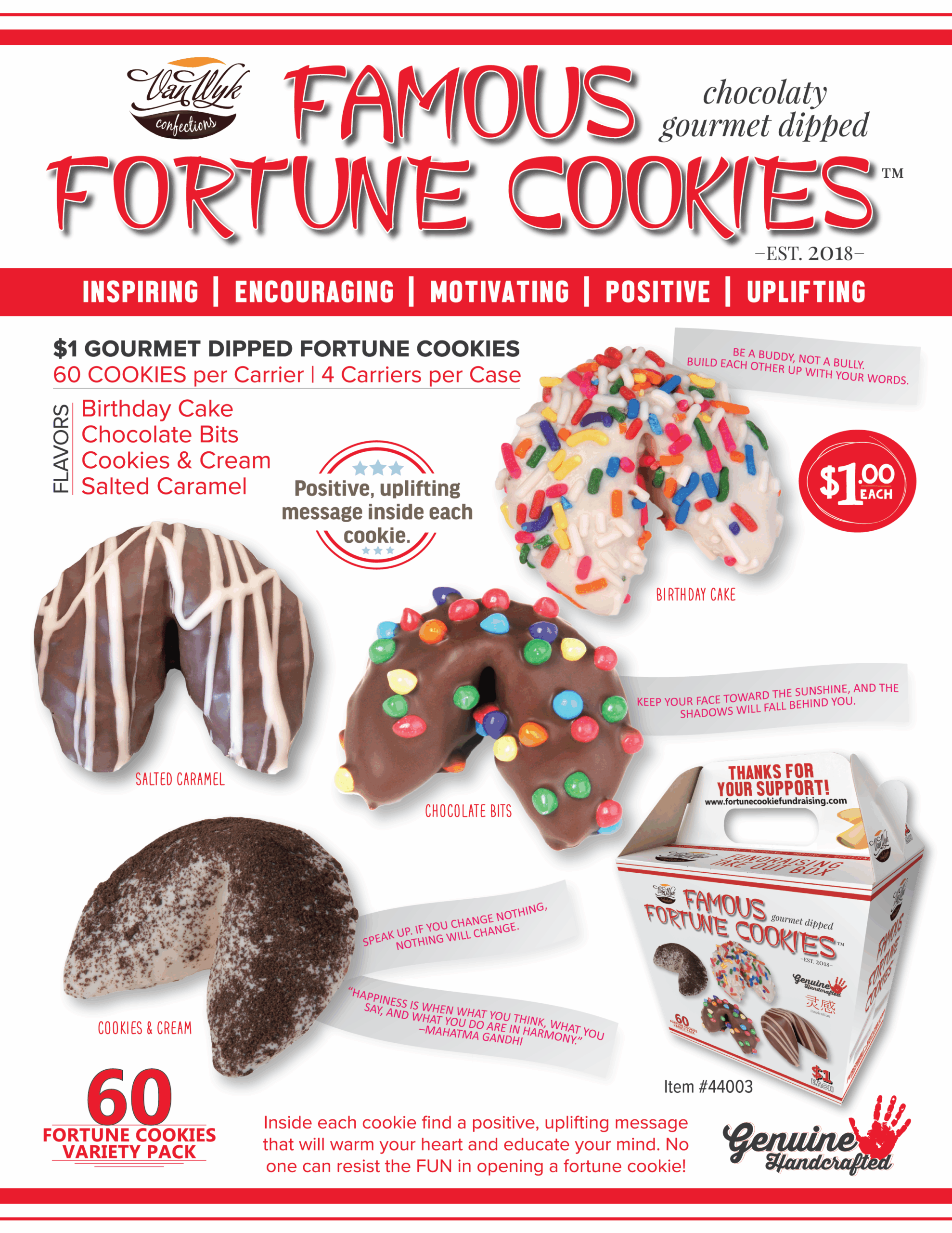 Famous Fortune Cookies are truly one of a kind! They bring a positive twist to an iconic snack. These fortune cookies are simply delicious, but the message inside is what truly makes them special. Inside each cookie is an uplifting, positive message that will warm your heart and make you smile. Promote anti-bullying, bring joy and spread a smile across your face. No one can resist the FUN in opening a fortune cookie!